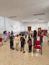 Lo harán tres veces: una sin música, para probar. Otra sin música, para recordar posiciones y posturas y, una tercera con música para que sientan que forma parte de una coreografía: primero pieza a pieza y luego todas/os entrando y saliendo de la escena a la vez. Entre medias, juegan a que imitan a la artista bailando como ella y atendiendo a las directrices de la entrada y salida de la escena.
