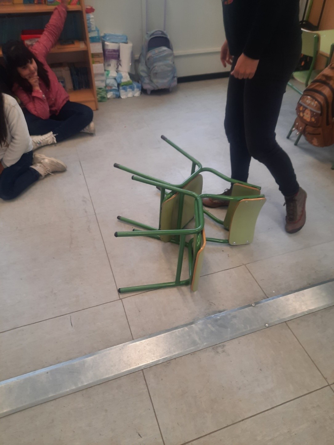 En esta sesión se ha trabajado la influencia de los objetos que nos acompañan, su condicionamiento, lo que implican en nuestras vidas, las mil posibilidades de interaccionar con ellos. Desde la posición y movimiento de las sillas del aula (mayor o menor distancia, tumbadas o de pie…) han inventado historias muy creativas.